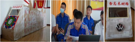 西柏坡精神是部生動(dòng)的教科書,車間工人黨員袁有德利用平時(shí)裝配件的紙盒子,創(chuàng)意性地制做了一列"團(tuán)結(jié)奮進(jìn)號(hào)"火車,邀請(qǐng)黨員一起乘車前行。袁有德說:"團(tuán)結(jié)奮進(jìn)號(hào)"列車蘊(yùn)含著學(xué)習(xí)西柏坡精神,強(qiáng)企富家、團(tuán)結(jié)奮進(jìn)的寓意,車頭前面的"大眾"標(biāo)識(shí)代表公司經(jīng)營(yíng)的品牌;八個(gè)綠色的大美孚機(jī)油蓋代表八方來財(cái),所有蓋口都向外代表招攬客戶,減少流失,而且像螺絲釘一樣牢牢釘??!車頭車尾標(biāo)有"勿忘來時(shí)路"的字樣,以此提醒廣大黨員干部不忘初心、牢記使命,一定不要忘記來時(shí)的路,回顧過去,展望未來,讓"團(tuán)結(jié)奮進(jìn)"號(hào)列車在西柏坡精神的感召下前行。支部要求,在疫情防控和汽車行車嚴(yán)竣的形勢(shì)下,我們每一個(gè)物產(chǎn)汽貿(mào)員工都是新時(shí)代的答卷者,讓"團(tuán)結(jié)奮進(jìn)號(hào)"奔馳在新時(shí)代的征程上,承載著中國(guó)夢(mèng)、物產(chǎn)夢(mèng),承載著物產(chǎn)汽貿(mào)職工群眾對(duì)美好生活的向往,風(fēng)馳電掣,勇往直前,奔向未來!